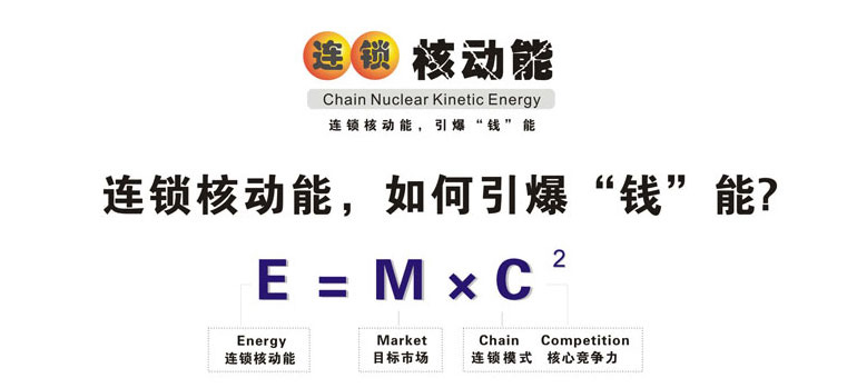 ,這是世界著名的愛因斯坦能量公式。基于愛因斯坦的相對論和能量公式,產(chǎn)生了原子彈和核電站,今天的人類太空實踐證實了愛因斯坦理論的正確性,人類因此發(fā)生了翻天覆地的變化。在愛因斯坦的能量公式中,M是質(zhì)量,C是光速,當速度為光速時,即使很小的質(zhì)量也能轉(zhuǎn)化為非常大的能量。 廣州采納企業(yè)管理顧問有限公司首席咨詢師陳宏創(chuàng)建的的連鎖核動能理論(全名:連鎖內(nèi)核能量裂變激增理論)是以愛因斯坦的能量公式為基礎創(chuàng)建,但其含義和指向是不同的:M=目標市場(Market),C1=連鎖模式(Chain),C2 =核心競爭力(Competition),其理論意義是,企業(yè)找準了目標市場,以連鎖的方式經(jīng)營,核心競爭力越大,推動其發(fā)展能量就越大。 連鎖核動能理論如何幫助連鎖企業(yè)“引爆錢能”快速發(fā)展?我們用深入淺出的圖形表達方式對該理論進行分層闡述: